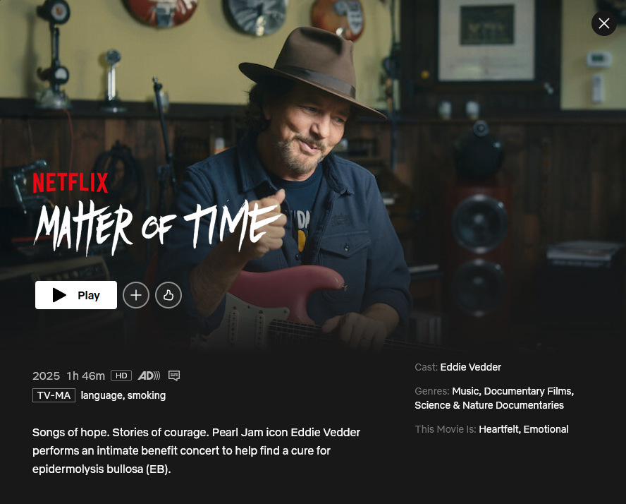Een akoestisch concert van Eddie Vedder dient een hoger doel in Matter of Time, een geëngageerde documentaire die doorleefde optredens verweeft met een aangrijpend ziektebeeld. Kinderen die geboren worden met de zeldzame genetische huidaandoening EB (Epidermolysis bullosa) hebben dankzij gevorderd medisch onderzoek uitzicht op beterschap.